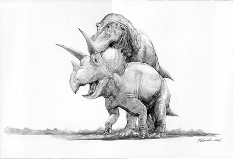共食いといっても、生きたもの同士が殺し合いをしたのか、たまたま死体として転がっていたものを食べたのか、明確な回答はない。科学的に正確さを考慮するなら、死体を食べる場面が無難ではあるのだけど、動きのある場面を描くために、あえて格闘する2頭を描くことにした。
