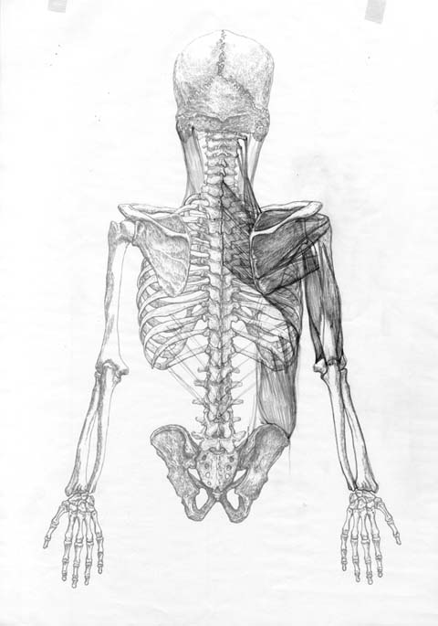 トレーシングペーパーをかけて、上肢帯の筋肉を描き込んでいく。まずは深い部分から。