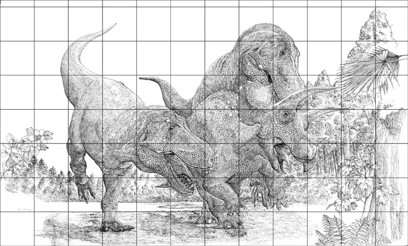 まずはトリケラトプスを完成するよう、ひたすら描く。特に鱗がしんどい。恐竜の場合、写真を見て描くことができないため、鱗のサイズや筋肉のふくらみなどを、模索しながら進めなくてはならないので、どうしても時間がかかってしまう。いくら小さな下絵があったとしても、大きなサイズになったときとでは違いがある。